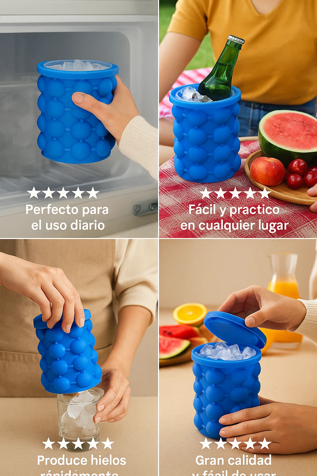 Para todo: agua, jugos, café helado o mantener una botella fría en picnic. Hielo listo para cada ocasión.